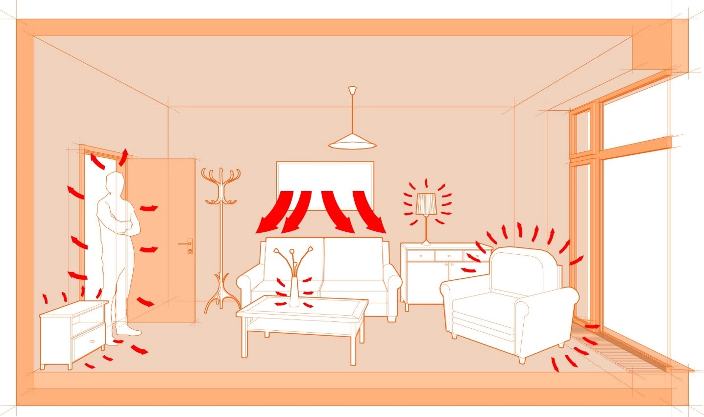 Nevidljivi infracrveni valovi izlaze iz panela i putuju kroz prostoriju.